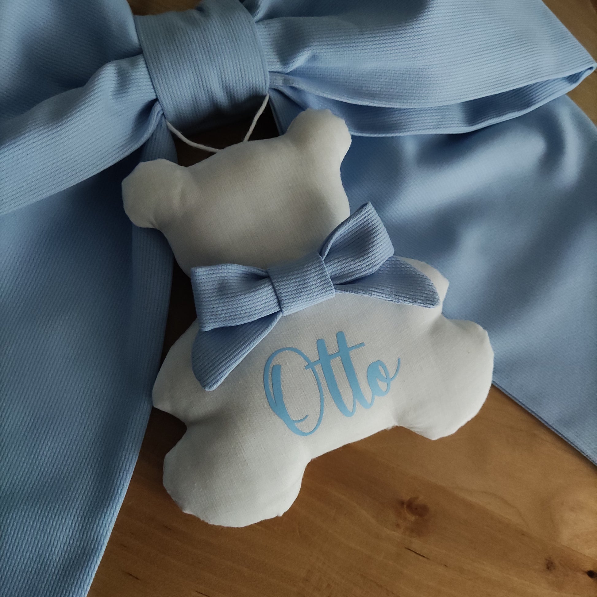 Il nome è disponibile sia ricamato a macchina che stampato su vinile termoadesivo e sarà sempre in tinta con il tessuto scelto (SCRIVILO AL CHECK OUT IN "Order special instructions").