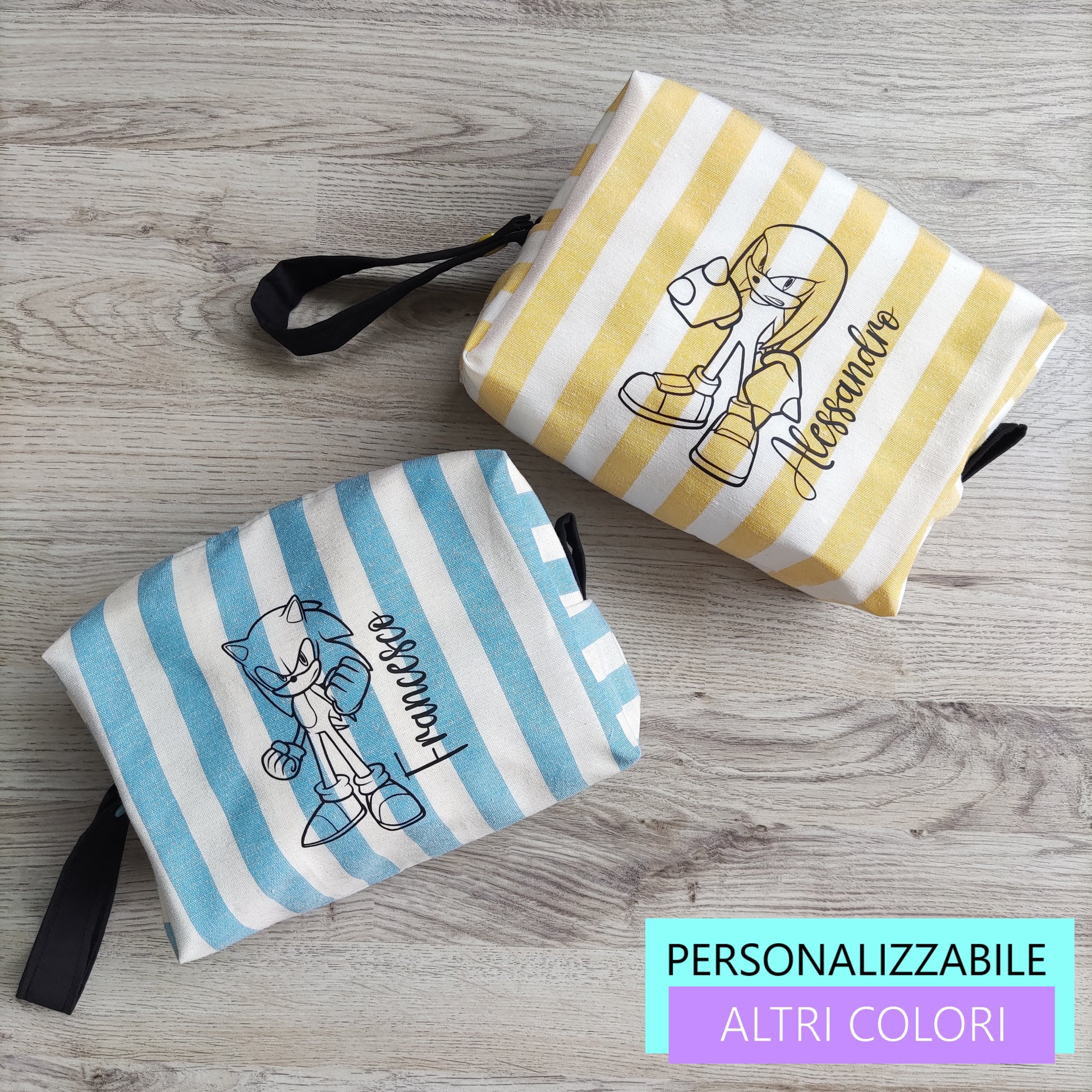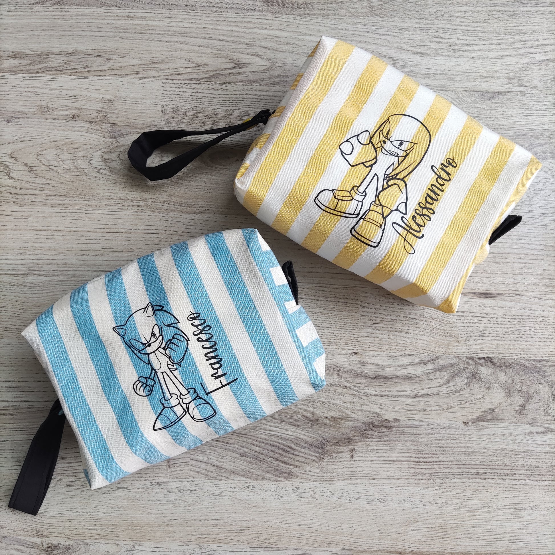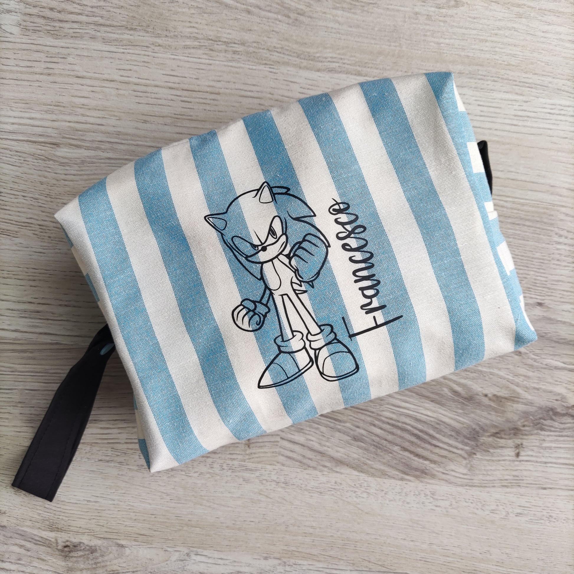 Pochette a righe con disegno e nome stampato in termo vinile, fodera in spugna cerata.