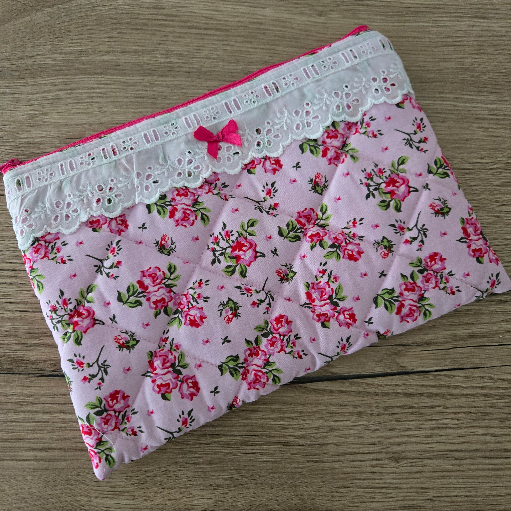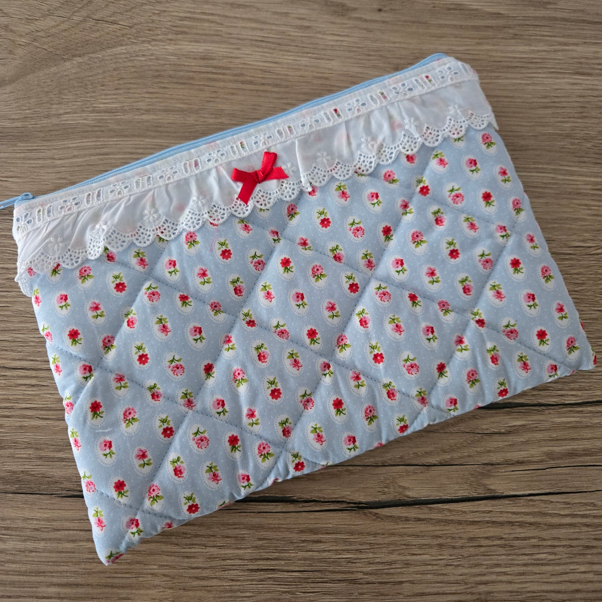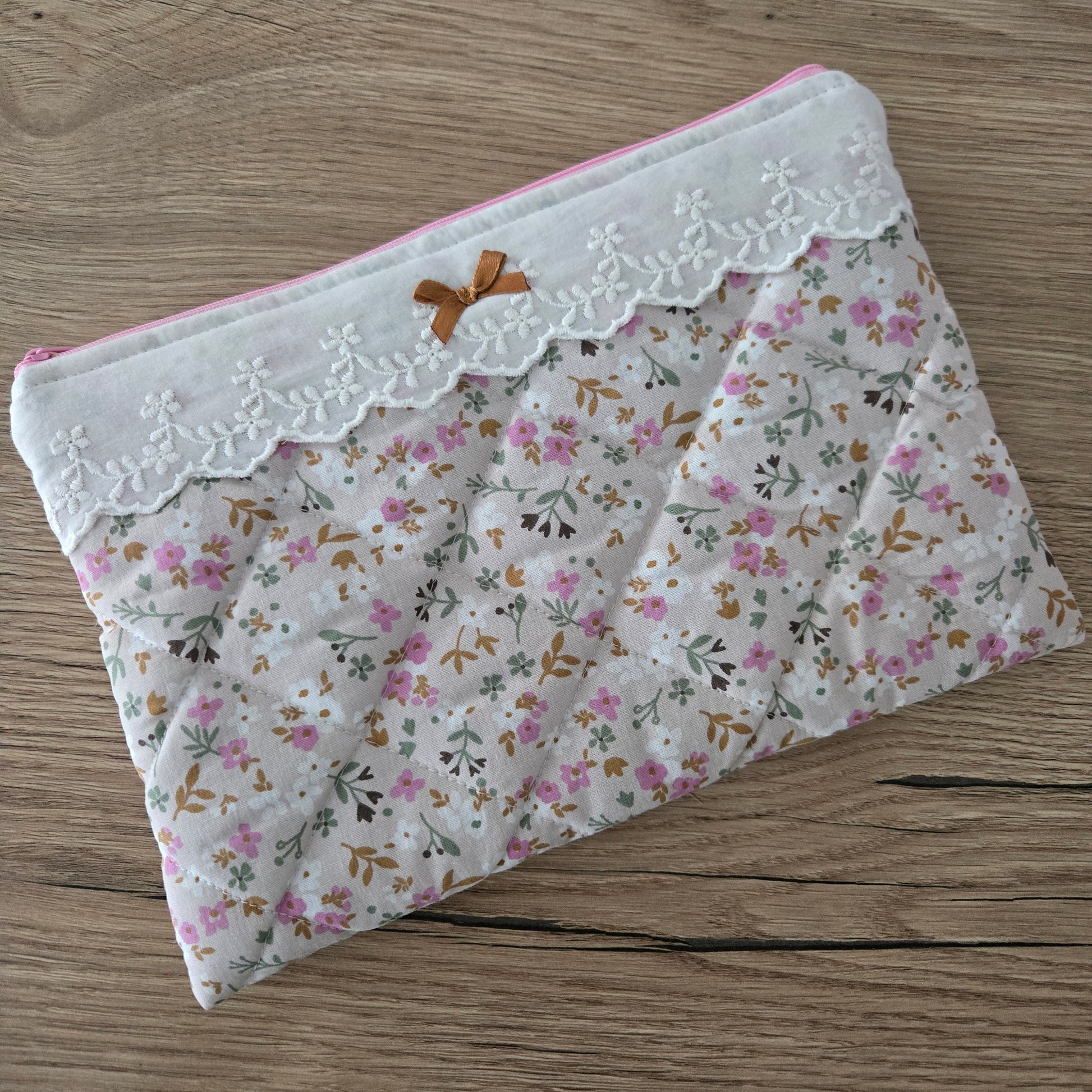 Pochette trapuntata fantasia fiori con fiocchetto e pizzo.