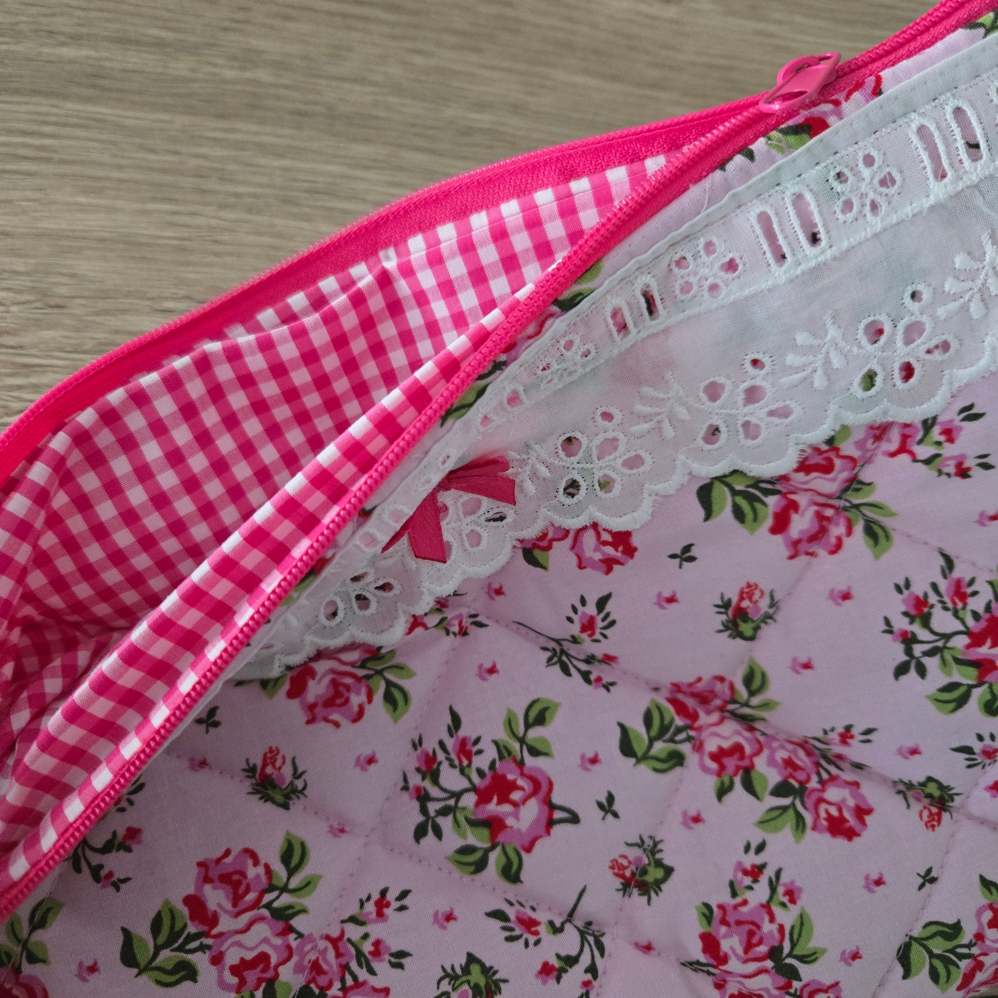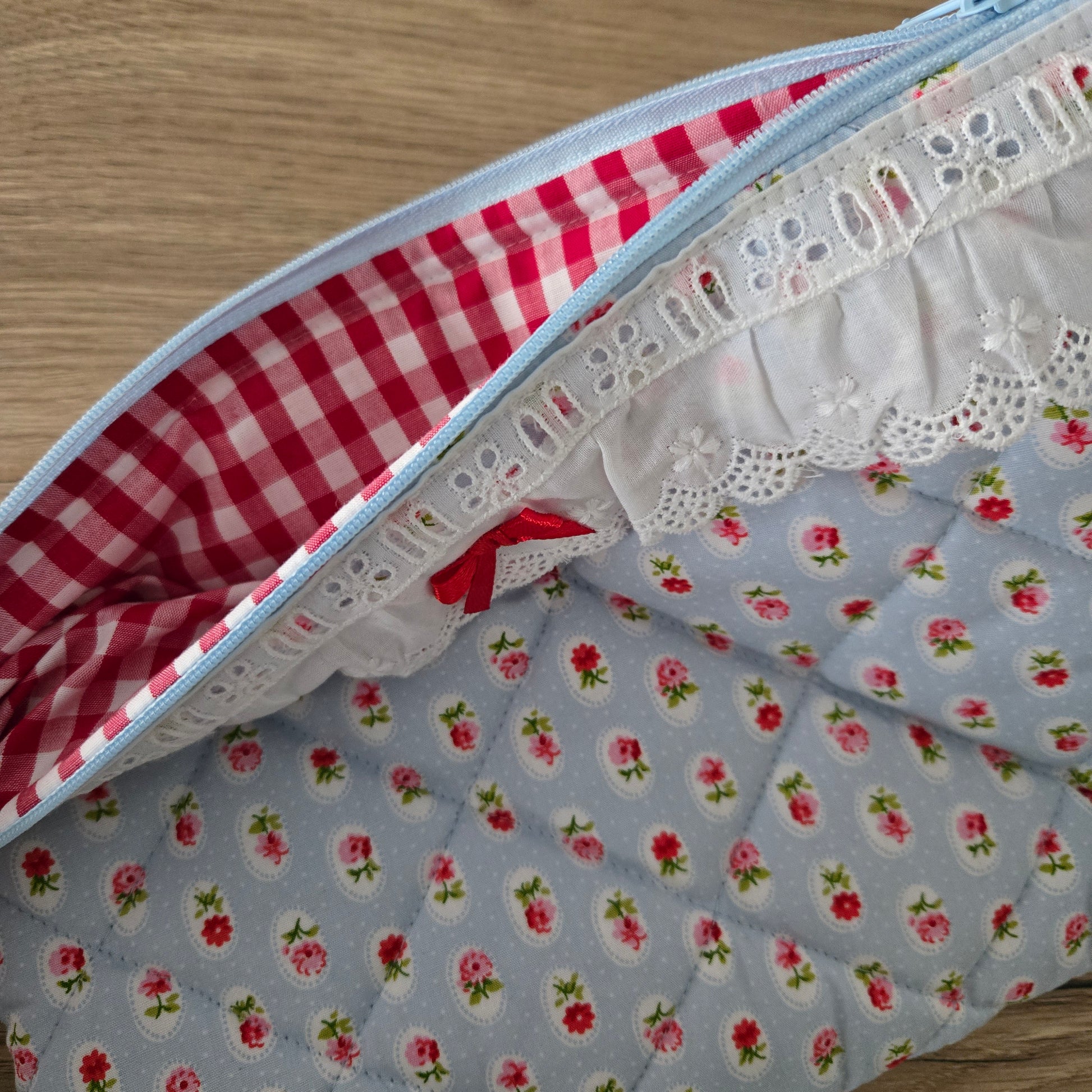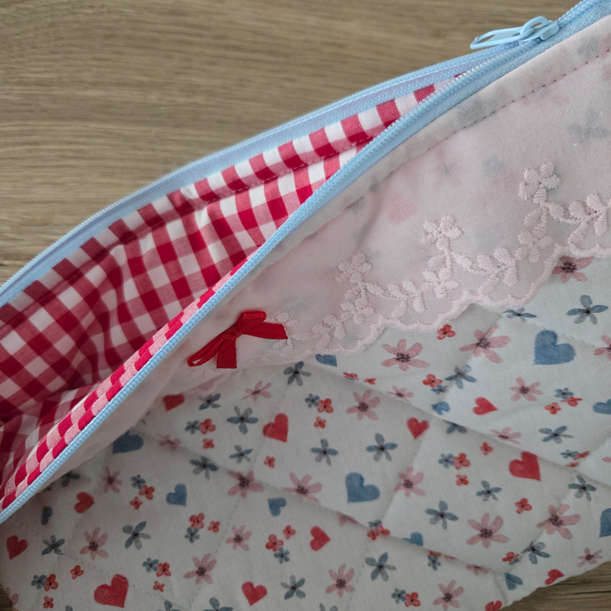 Pochette trapuntata fantasia fiori con fiocchetto e pizzo.