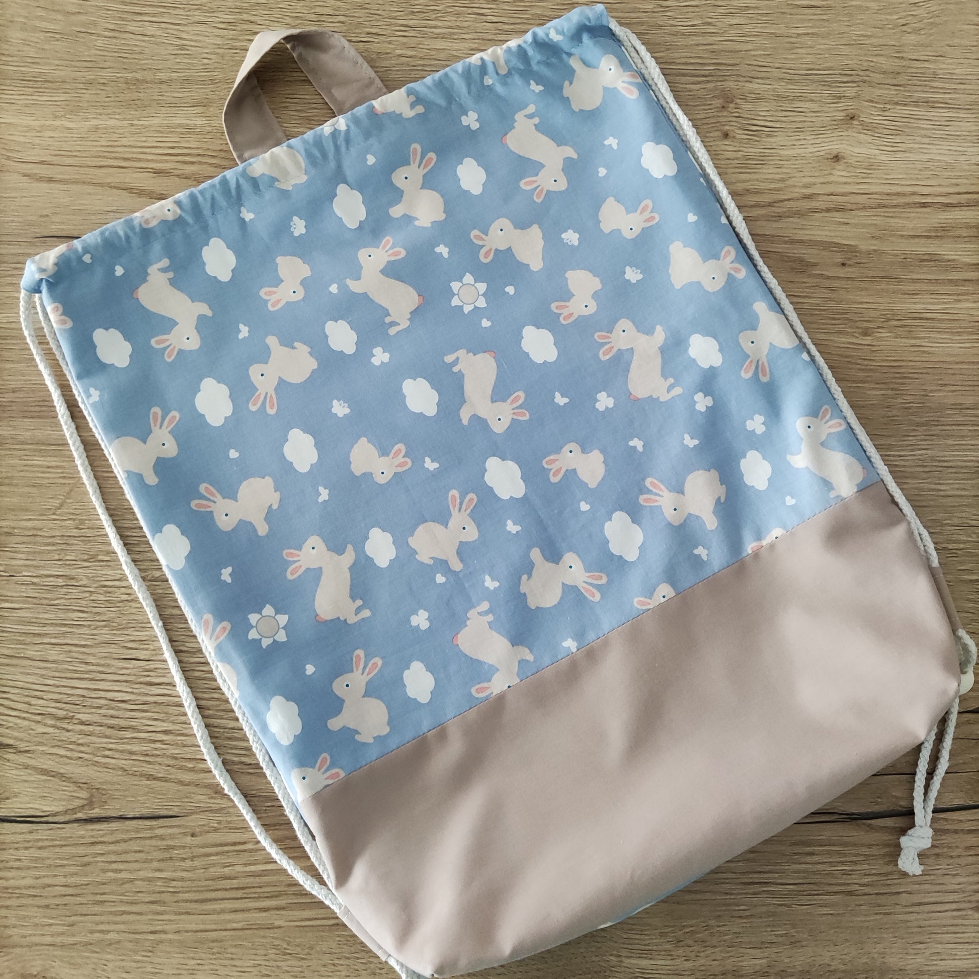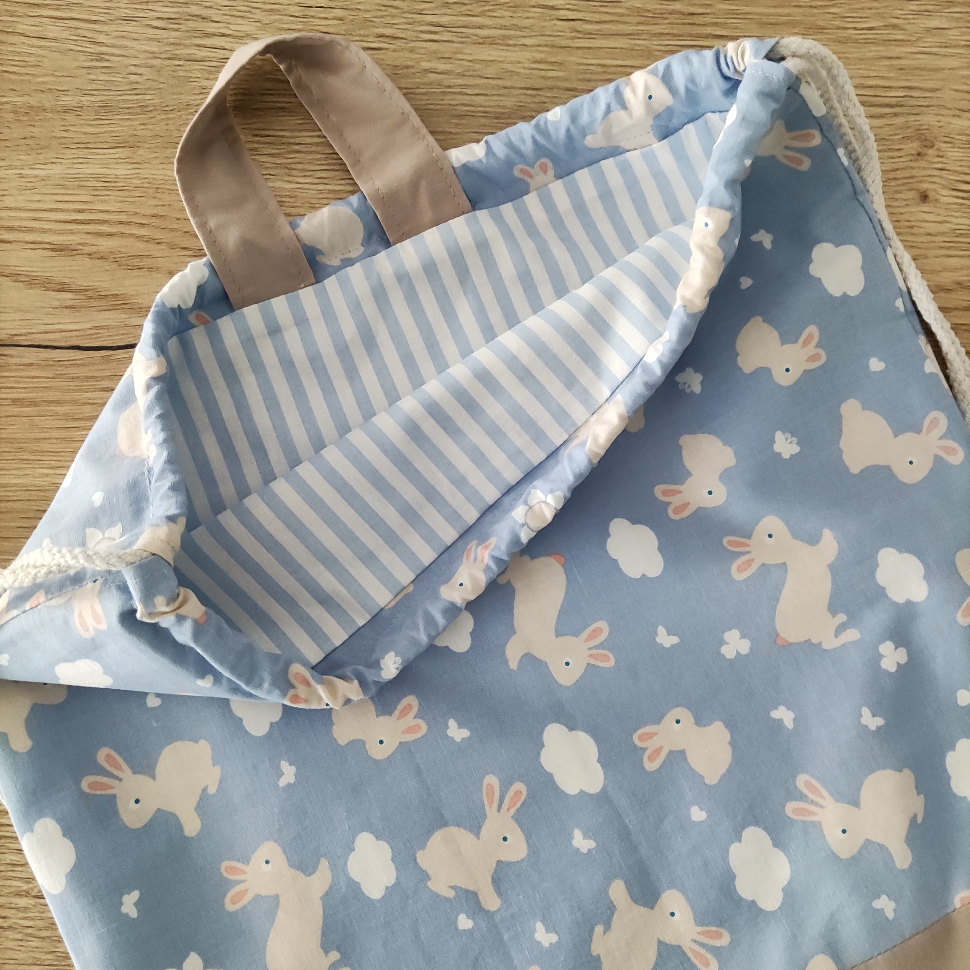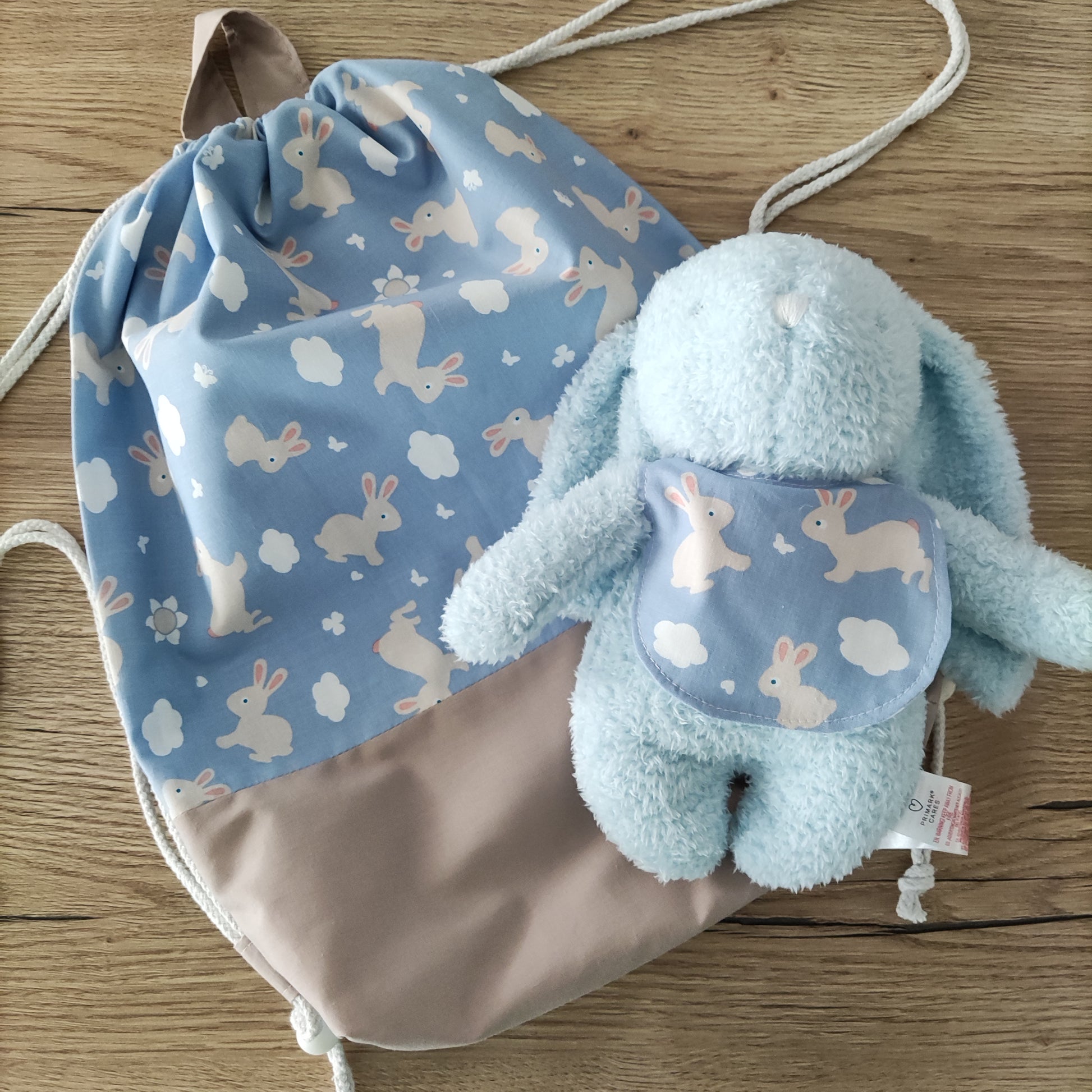 Sacca zainetto 100% cotone e coniglietto peluche con bavaglino abbinato.