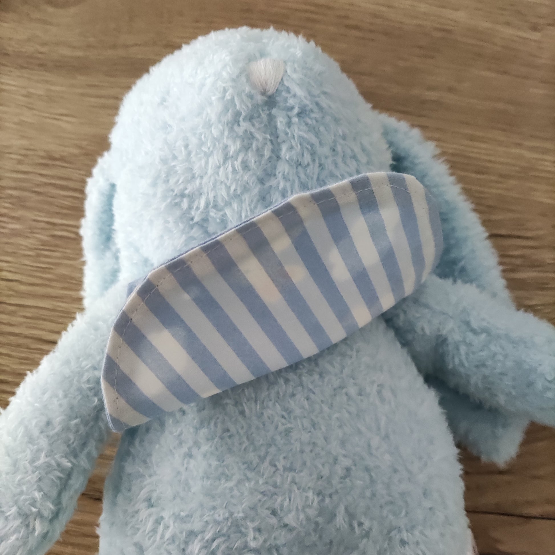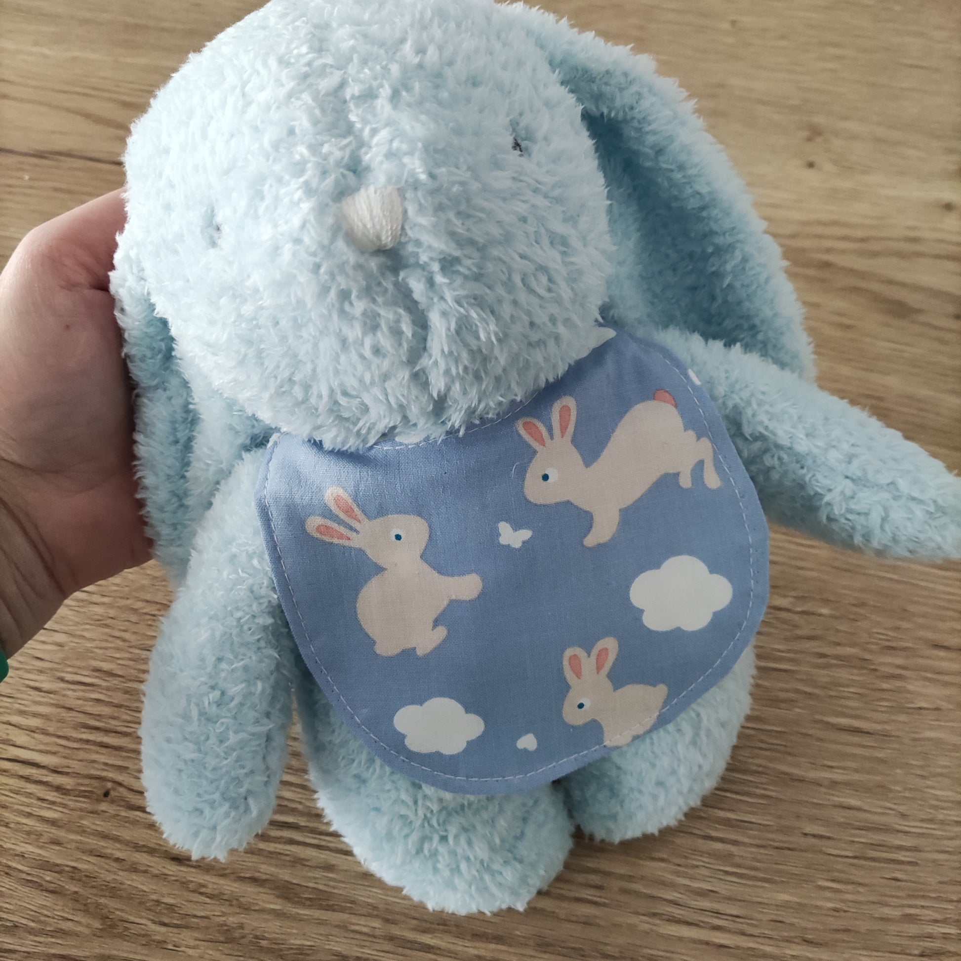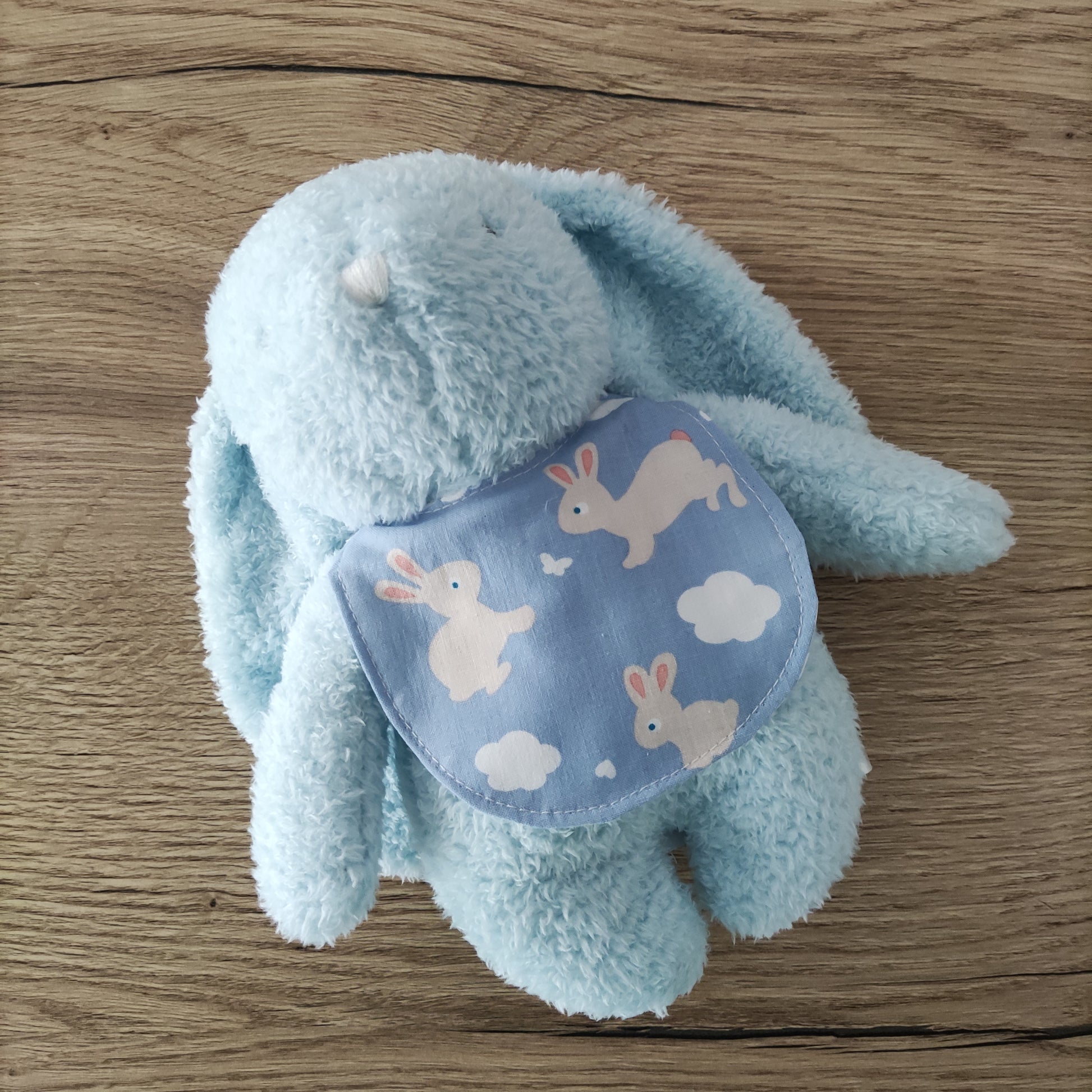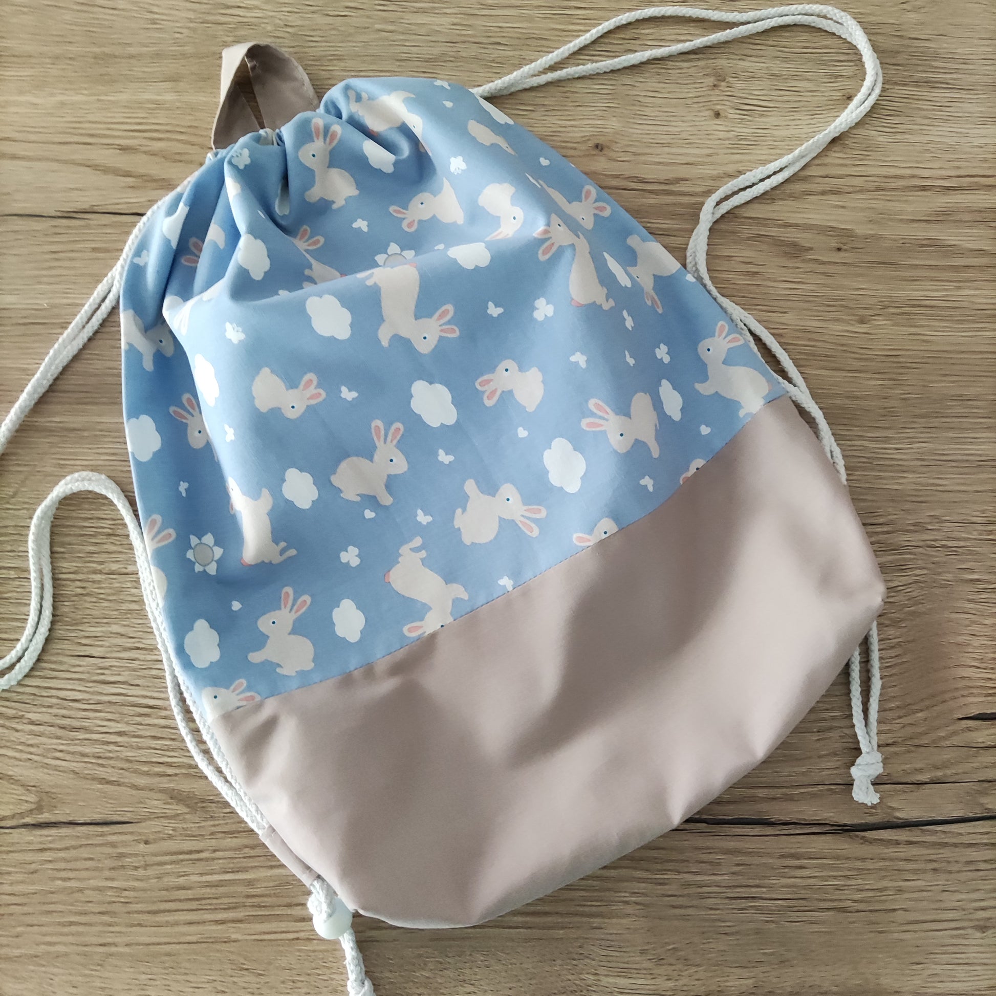 Sacca zainetto 100% cotone e coniglietto peluche con bavaglino abbinato.
